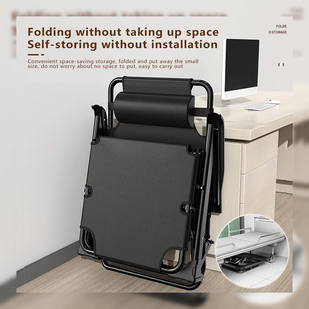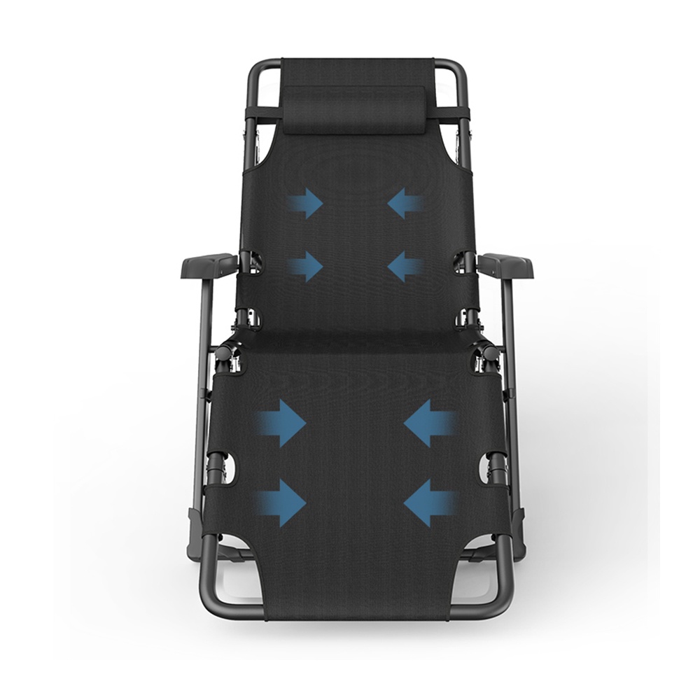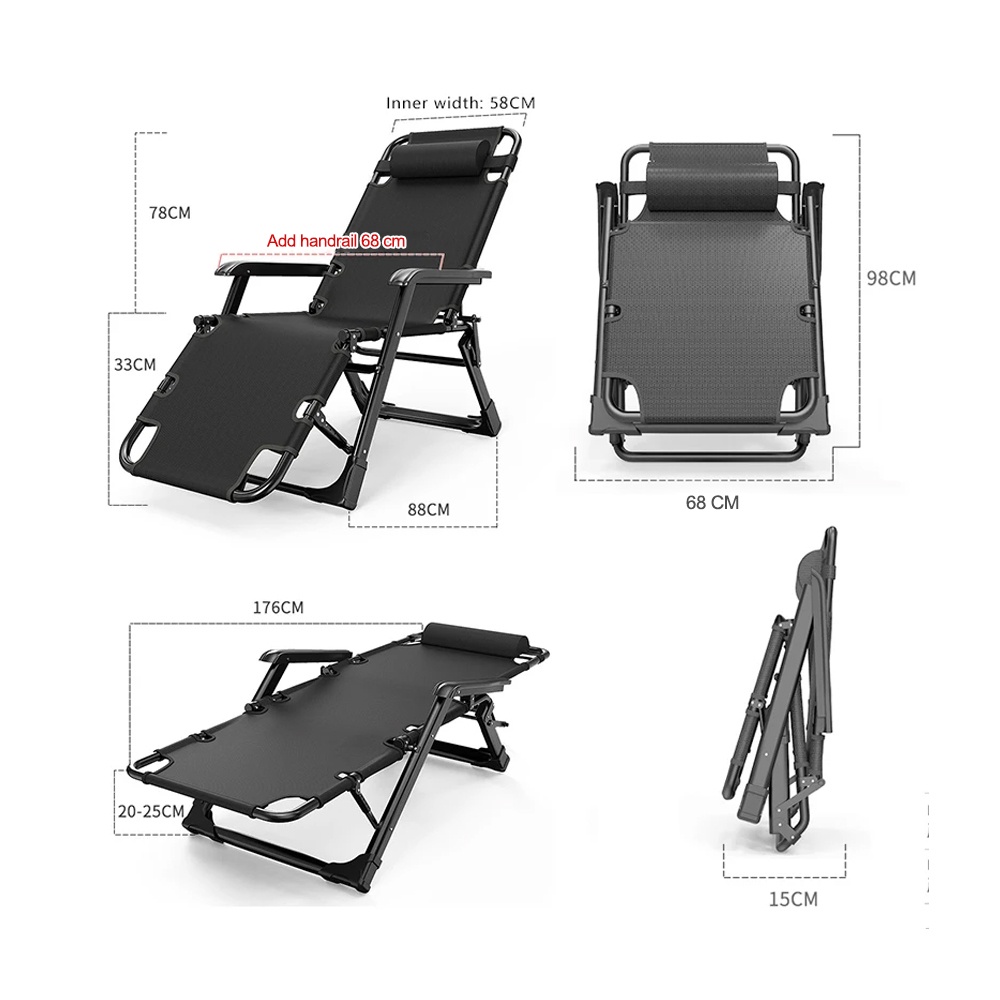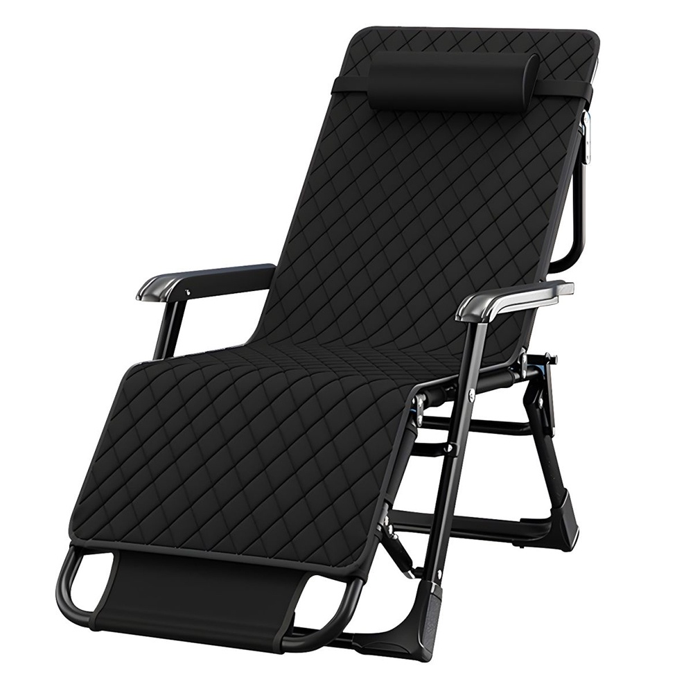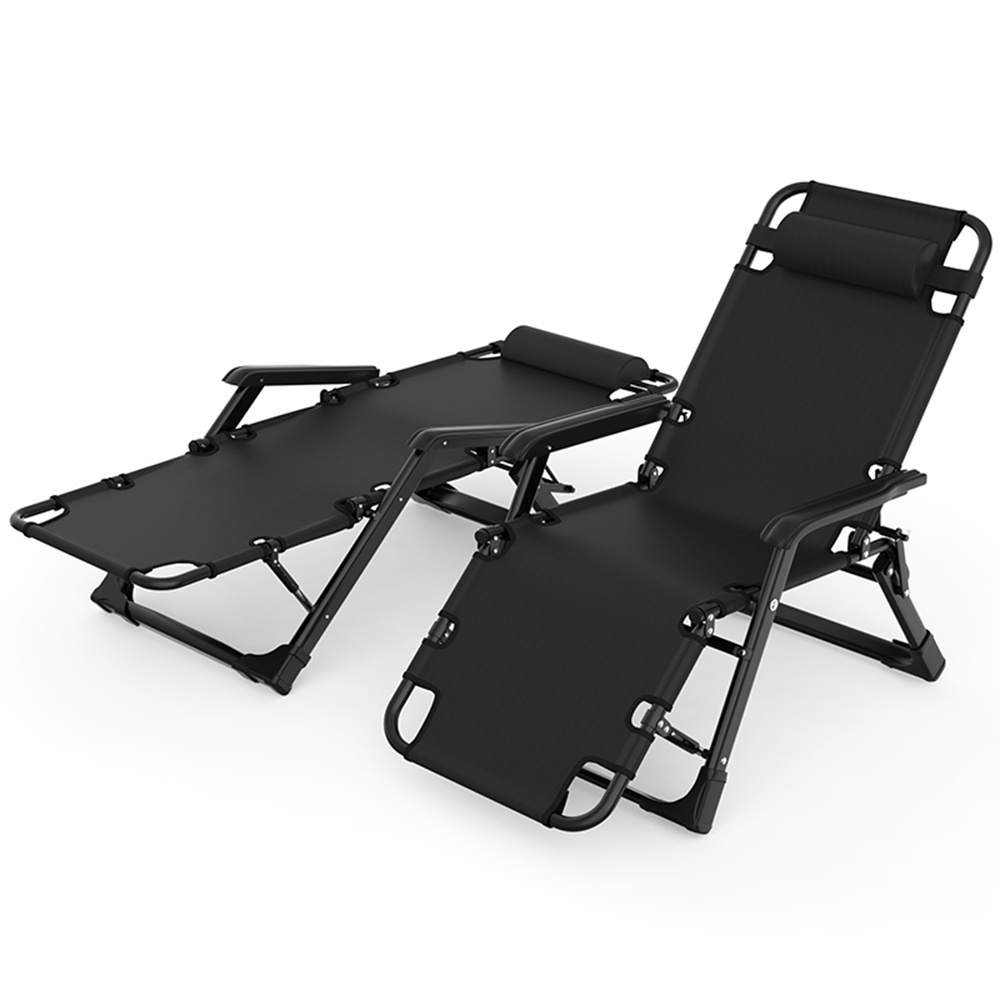 كرسي استرخاء قابل للطي بزاوية 180° – هيكل معدني اسود ومسند ذراع مزود بمرتبة منخفضة لون اسود لراحة تدوم