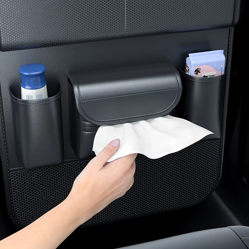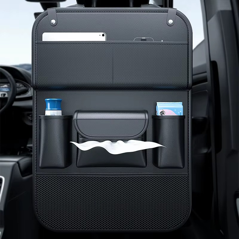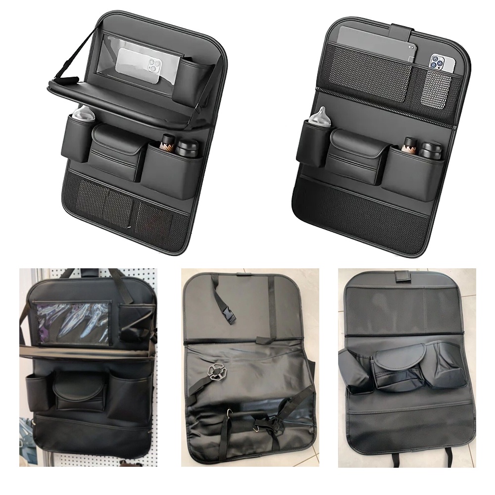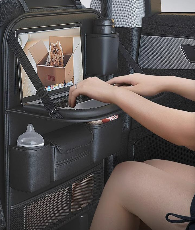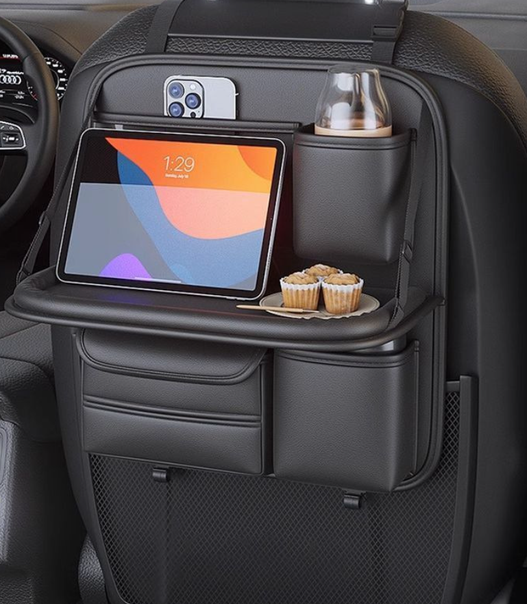 المنظم فيه أماكن متعددة للتخزين زي حامل أكواب، مكان للمناديل، وجيوب لحفظ الموبايل أو الشاحن أو أي أغراض صغيرة. التصميم عملي جدًا وبيساعد على الحفاظ على العربية منظمة ونظيفة طول الوقت. الطاولة بتتقفل بسهولة لما مش بتستخدمها علشان توفر مساحة للركاب في الخلف.