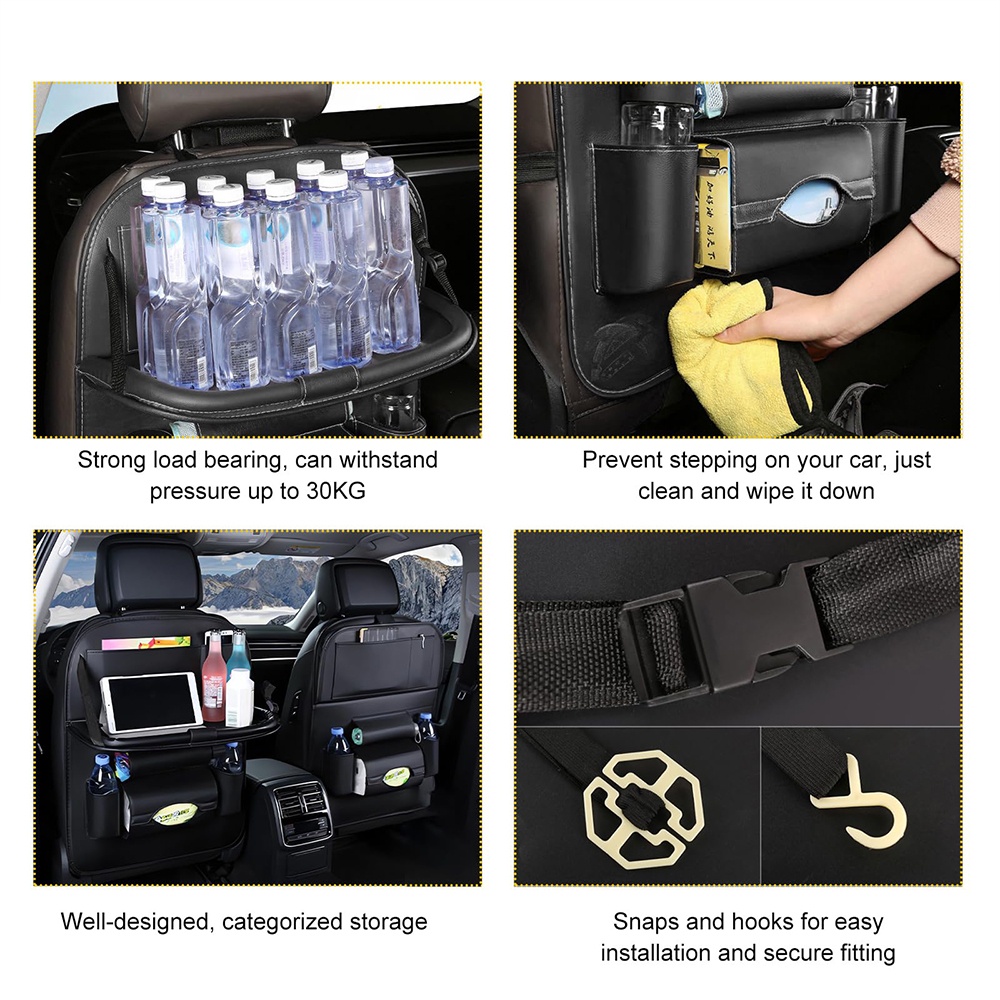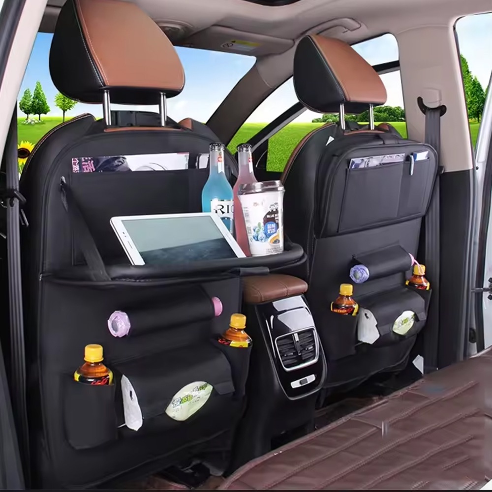 المنظم فيه أماكن متعددة للتخزين زي حامل أكواب، مكان للمناديل، وجيوب لحفظ الموبايل أو الشاحن أو أي أغراض صغيرة. التصميم عملي جدًا وبيساعد على الحفاظ على العربية منظمة ونظيفة طول الوقت. الطاولة بتتقفل بسهولة لما مش بتستخدمها علشان توفر مساحة للركاب في الخلف.
