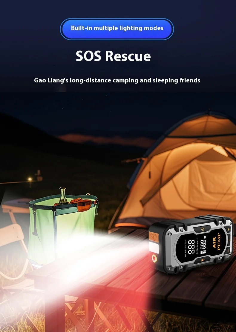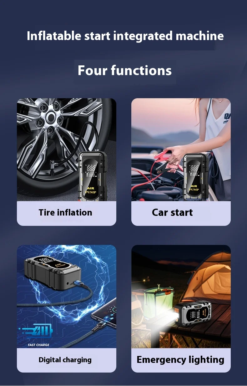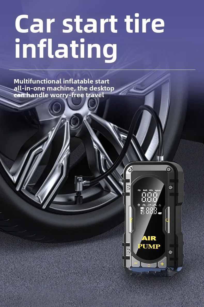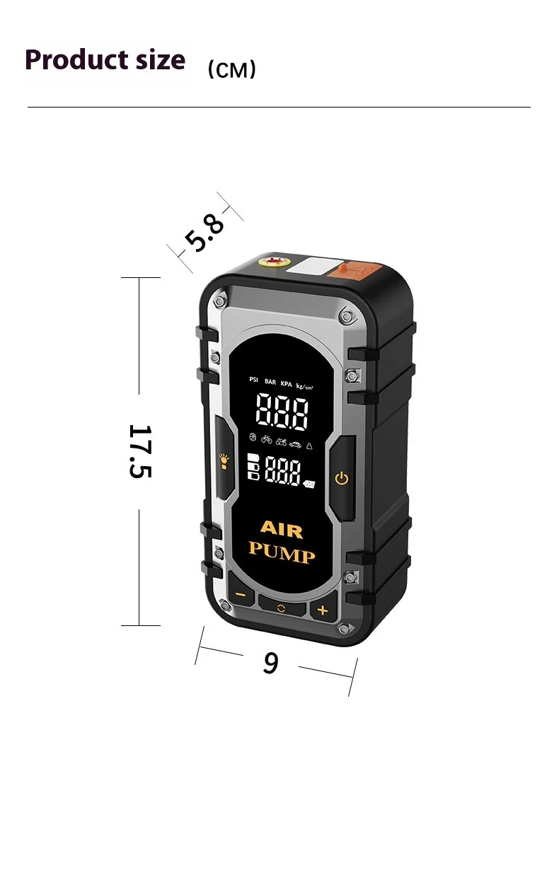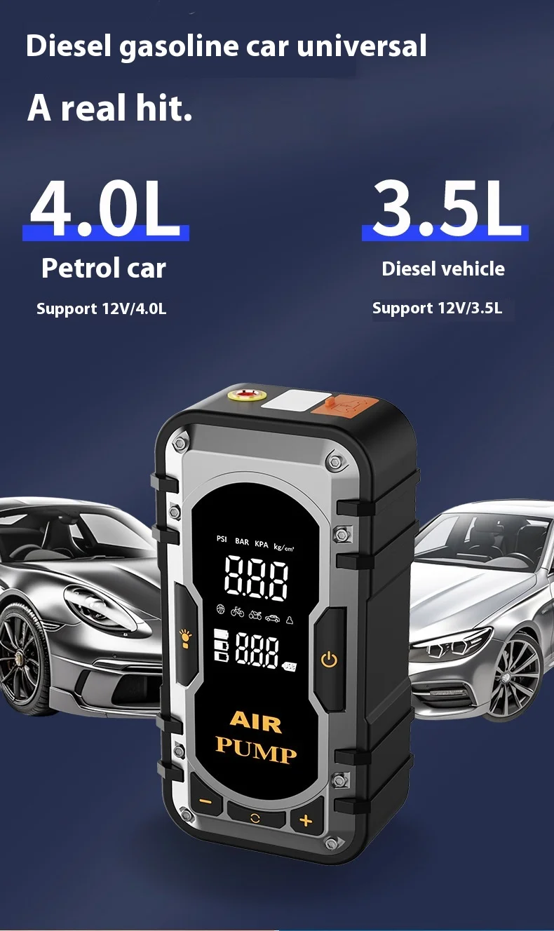 ج.ماحصل على حل متكامل للطوارئ في سيارتك مع جهاز 2 في 1 يجمع بين منفاخ الهواء القوي وجهاز تشغيل البطارية (Jump Starter). تصميم عملي ومحمول يناسب الاستخدام اليومي والطوارئ، سواء كنت على الطريق أو في البيت.