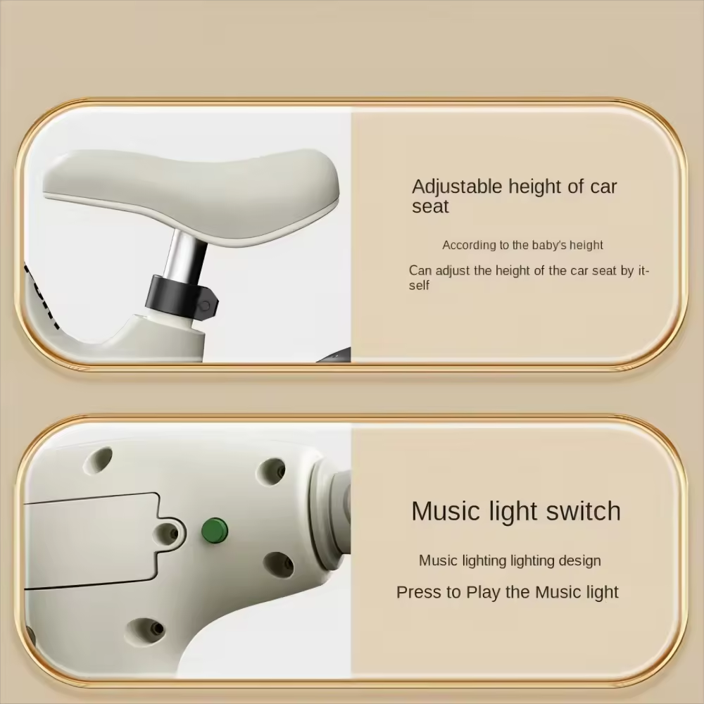 مصنوعة من ال بي في سي القوي، بثلاث عجلات لضمان الثبات، وتناسب الأطفال من عمر سنة ، ما يجعلها مثالية لتطوير التوازن، الحركة، والمرح.